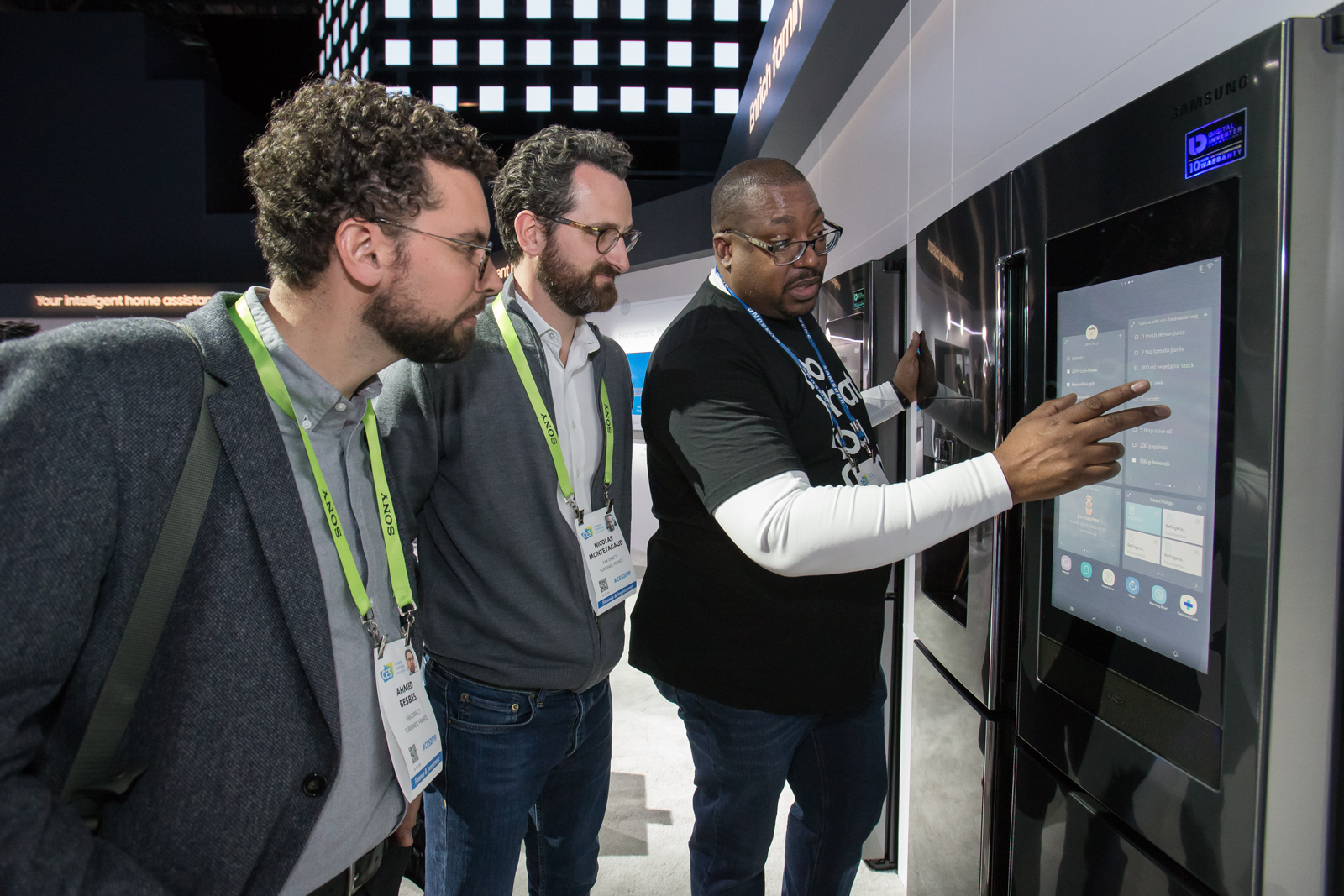 ▲ 미국 라스베이거스에서 열리는 세계 최대 전자 전시회 CES 2019 개막일인 8일(현지시간) 삼성전자 전시관에서 관람객들이 패밀리허브 스크린을 통해 냉장고 문을 열지 않고도 내부의 식재료를 들여다 보고 있다.