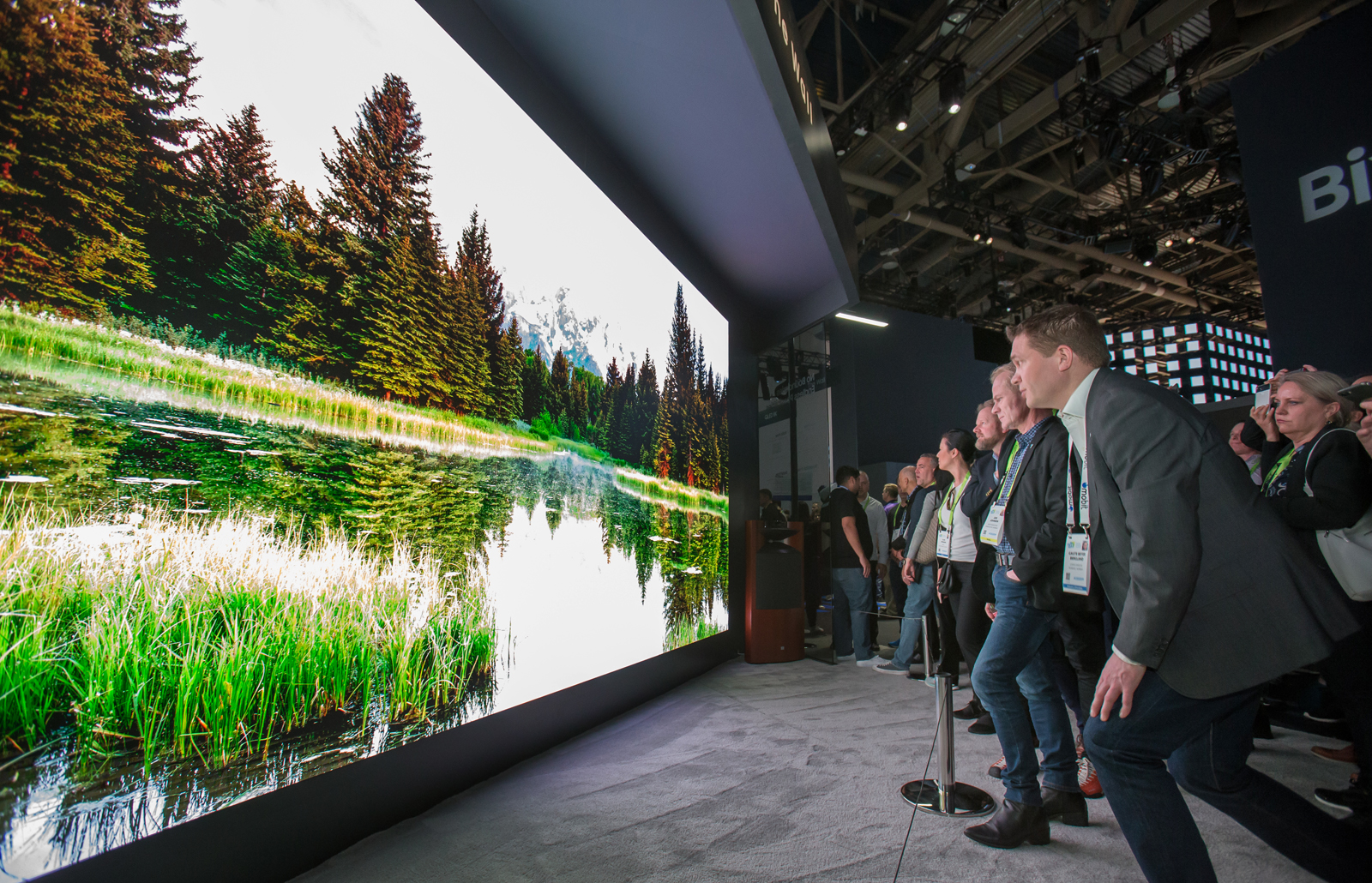 ▲ 미국 라스베이거스에서 열린 세계 최대 전자 전시회 CES2019에서 삼성전자 전시관에 방문한 관람객들이 219형의 압도적인 크기와 생생한 화질을 자랑하는 마이크로 LED 스크린 '더 월'을 통해 마치 수목 공원에 온 것 같은 현장감을 느끼며 감탄하고 있다.