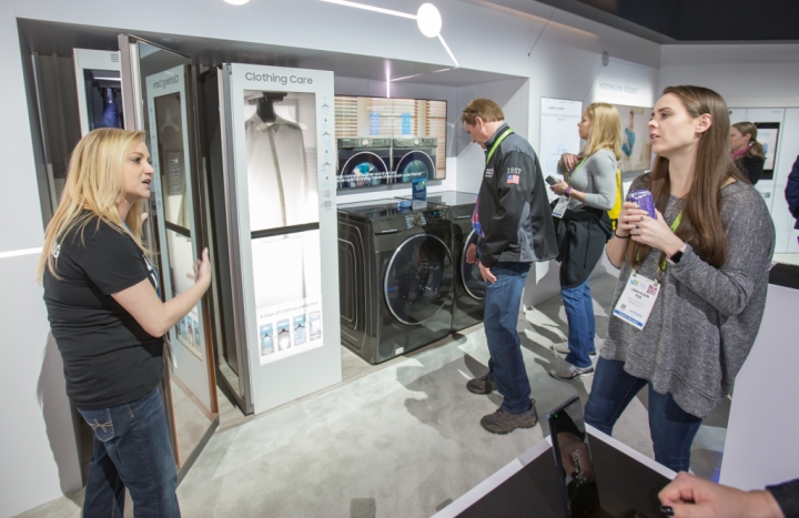 ▲ 미국 라스베이거스에서 열린 세계 최대 전자 전시회 CES2019에서 삼성전자 전시관에 방문한 관람객이 의류관리기 '에어드레서'에 대한 설명을 듣고 있다. 에어드레서는 삼성전자가 최근 출시한 의류청정기로 에어•스팀•건조•청정의 4단계 전문 의류 청정 방식을 적용해 의류의 미세먼지와 냄새를 확실하게 제거해 주는 혁신 제품이다.