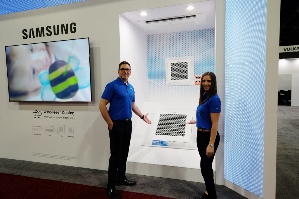▲ 삼성전자가 미국 조지아주 애틀랜타에서 열리는 ‘AHR엑스포’에 참가해 무풍에어컨을 포함해 북미 시장을 공략할 혁신 공조 솔루션을 대거 선보인다. 삼성전자 모델들이 무풍 4Way 카세트 제품을 소개하고 있다.