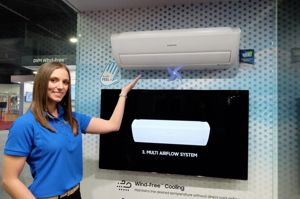 ▲ 삼성전자가 미국 조지아주 애틀랜타에서 열리는 ‘AHR엑스포’에 참가해 무풍에어컨을 포함해 북미 시장을 공략할 혁신 공조 솔루션을 대거 선보인다. 삼성전자 모델이 벽걸이형 무풍에어컨 제품을 소개하고 있다.