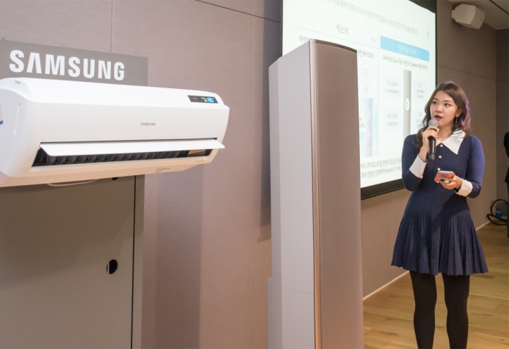 ▲ 삼성전자 생활가전사업부 직원(전략마케팅팀 이경주)이 삼성의 독자적인 인공지능 플랫폼 ‘뉴 빅스비’를 통한 ‘무풍에어컨’ 제품 시연을 하고 있다.
