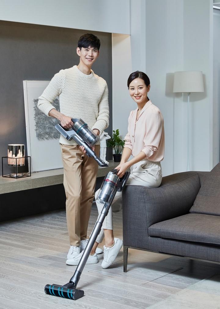 ▲ 삼성전자가 무선 청소기 업계 최고 수준인 200W(와트) 흡입력을 구현하고 차별화된 미세먼지 배출 차단 시스템을 갖춘 프리미엄 무선청소기 ‘삼성 제트’를 출시한다. 삼성전자 모델들이 무선 청소기 '삼성 제트'를 소개하고 있다.