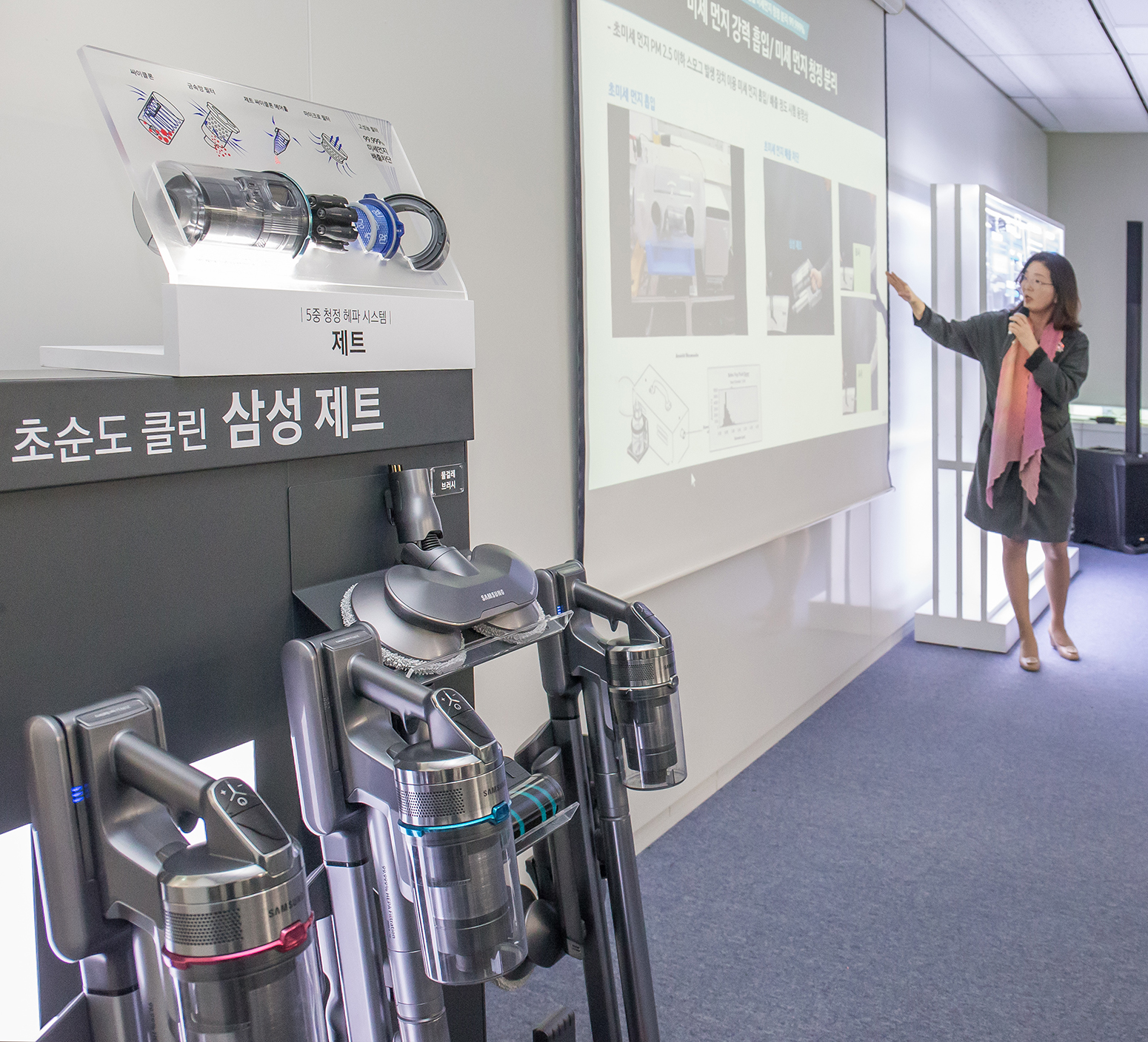 ▲ 삼성전자 생활가전사업부 청소기 상품기획담당 정유진 상무가 프리미엄 무선 청소기 ‘삼성 제트’에 대해 설명하고 있다.