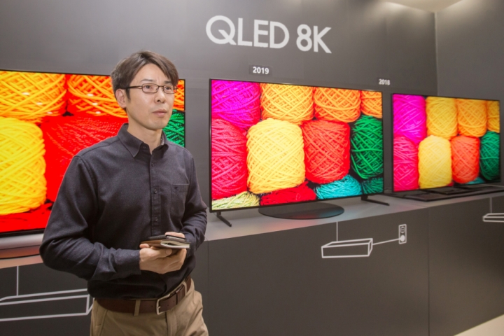 ▲ 삼성전자 연구원이 2019년형 QLED 8K의 화질을 시연하고 있다. QLED 8K는 입력되는 영상의 화질에 상관없이 8K 수준의 시청 경험을 제공하며, 새로운 화질 기술이 적용돼 한층 개선된 블랙 표현과 시야각을 자랑한다.