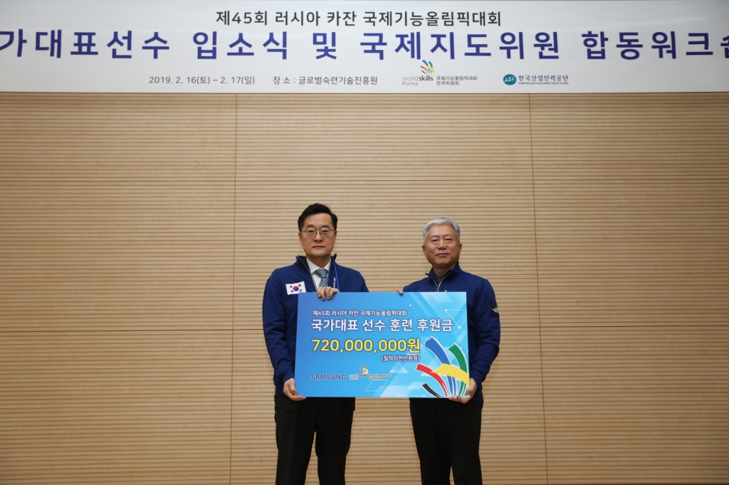삼성전자는 16일 인천 글로벌숙련기술진흥원에서 열린 ‘제45회 러시아 카잔 국제기능올림픽대회 국가대표 선수 입소식 및 국제지도위원 합동 워크숍’에서 국제기능올림픽대회 한국위원회에 후원금 7억2천만원을 전달했다.