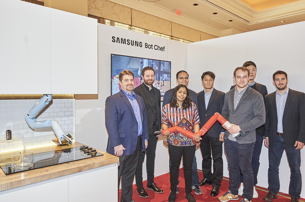 ▲ 삼성전자 임직원들이 조리보조 기능을 수행하는 '삼성봇 셰프'를 소개하고 있다.