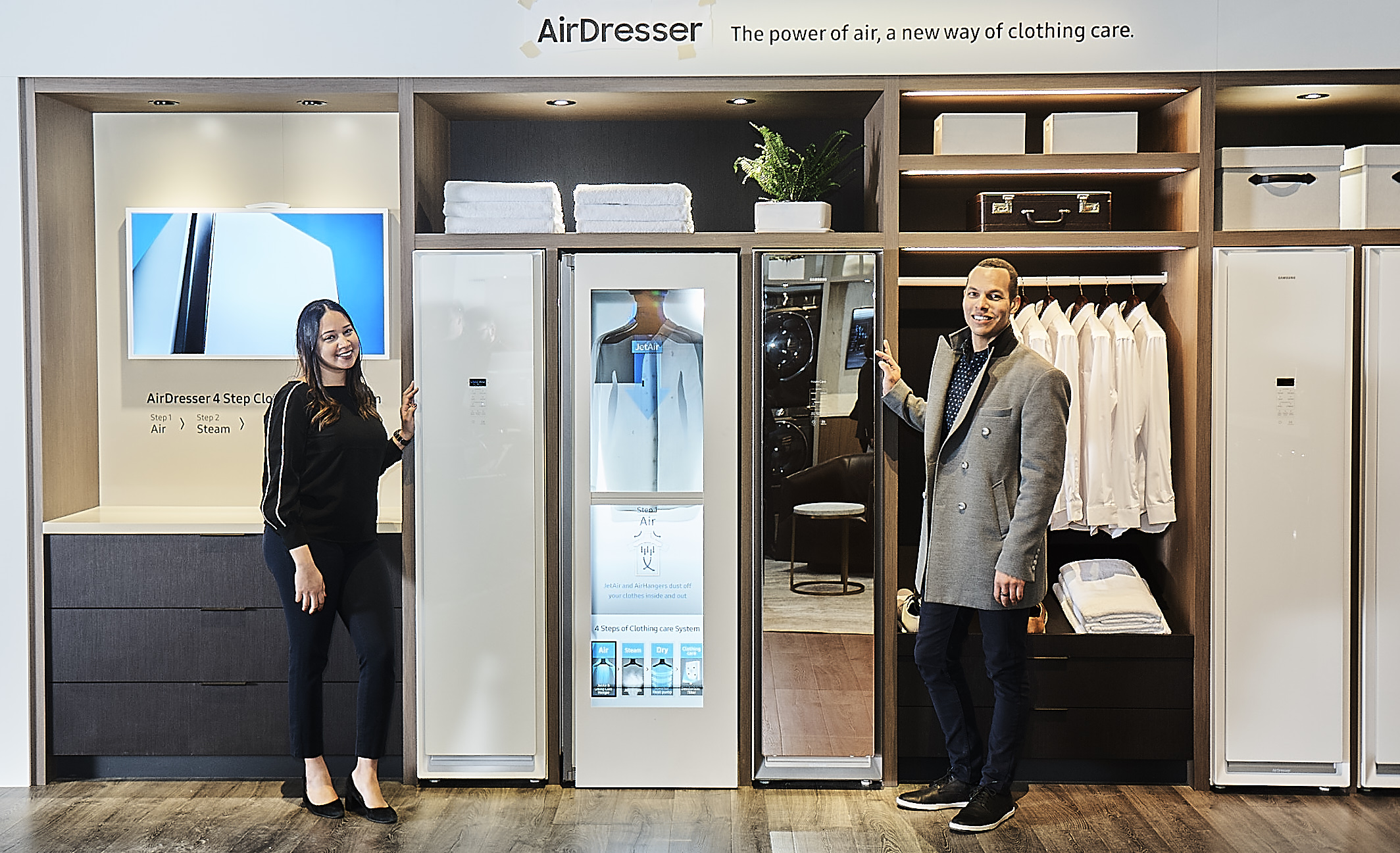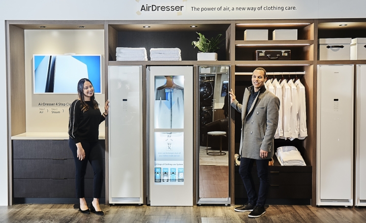 ▲ 삼성전자 직원들이 프리미엄 드레스룸과 세탁실 등으로 구성된 ‘라이프스타일 이노베이션 존’에서 삼성 의류관리기 ‘에어드레서’를 소개하고 있다.