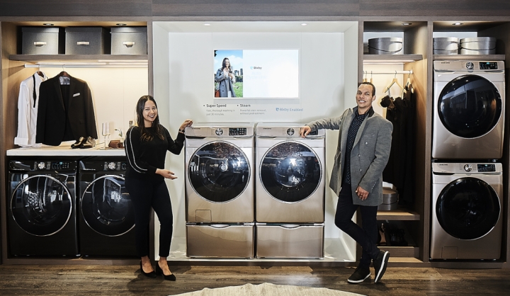 ▲ 삼성전자 직원들이 프리미엄 드레스룸과 세탁실 등으로 구성된 ‘라이프스타일 이노베이션 존’에서 세탁 시간을 획기적으로 줄여주면서도 탁월한 세탁력을 유지하는 미국 특화 세탁기 신제품을 선보이고 있다.