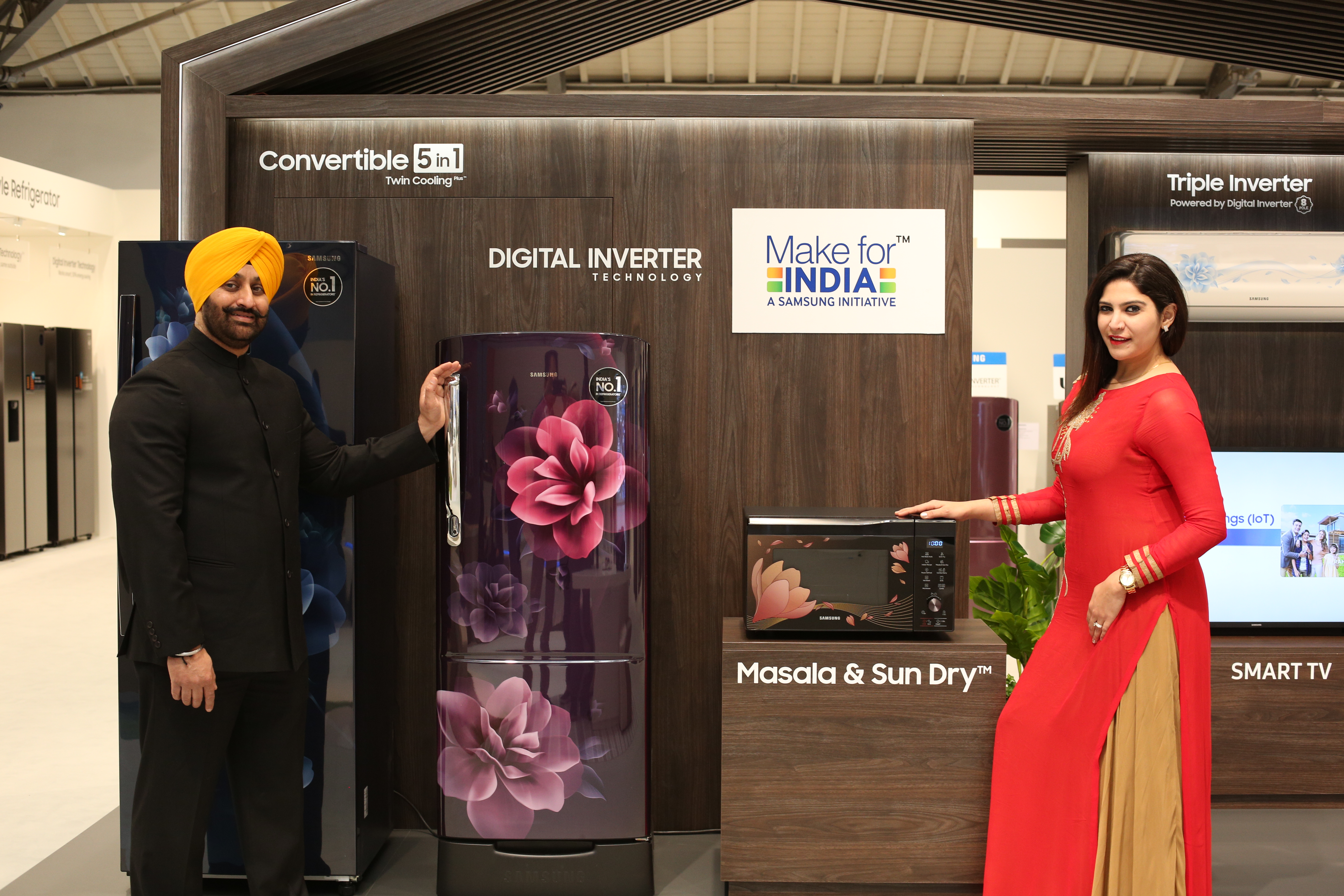 ▲ 삼성전자 모델들이 인도 지역에 특화된 냉장고와 전자레인지를 소개하고 있다.