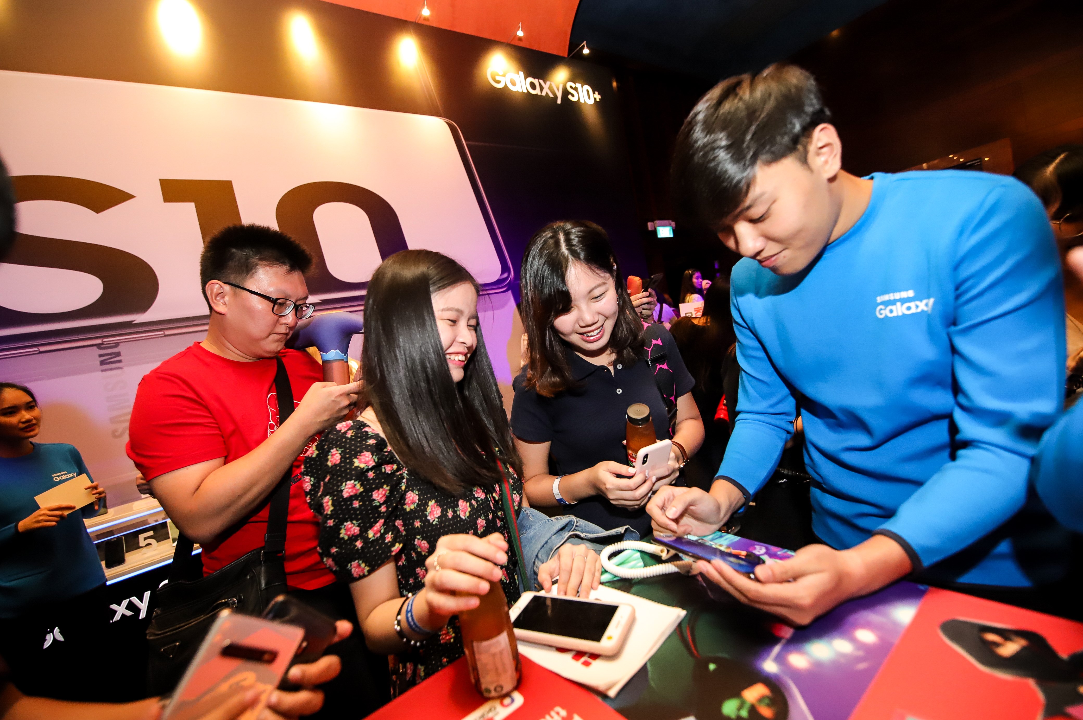 ▲ 21일(현지시간) 싱가포르에서 진행된 ‘갤럭시 S10’ 출시 행사 참석자들이 제품을 체험하고 있는 모습.