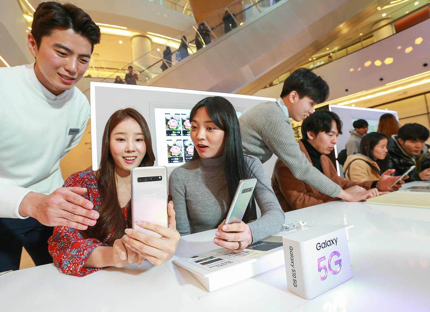 ▲ 갤럭시 스튜디오를 찾은 소비자들이 삼성전자 최초 5G 스마트폰 ‘갤럭시 S10 5G’를 체험하고 있다. 갤럭시 S10 5G 체험 공간은 타임스퀘어와 코엑스, 롯데월드몰 내에 마련된 갤럭시 스튜디오에서 만날 수 있다.