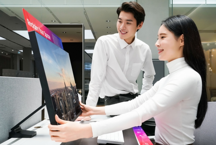 ▲ 삼성전자가 책상 위 공간 활용을 자유롭게 해 줄 ‘삼성 스페이스 모니터’를 한국 시장에 3월 4일 출시한다. 삼성전자 모델들이 스페이스 모니터를 소개하고 있다.
