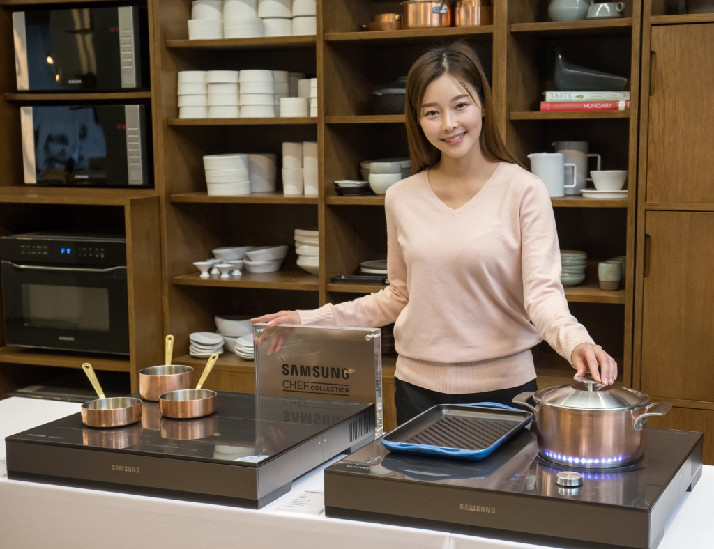 ▲ 삼성전자가 12일 서울 중구에 위치한 샘표 우리맛 공간에서 2019년형 삼성 전기레인지 인덕션 쇼케이스 행사를 개최하고, 삼성만의 차별화된 기술과 더 완벽한 조리를 위한 다양한 기능을 소개했다. 삼성전자 모델이 2019년형 셰프컬렉션 전기레인지 인덕션 제품을 소개하고 있다.