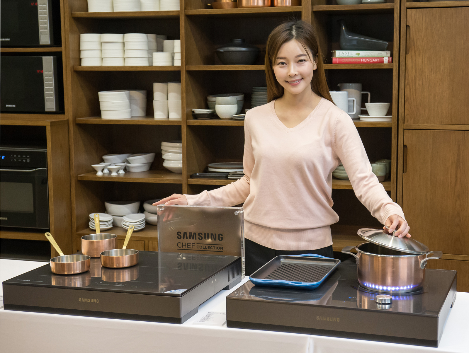 ▲ 삼성전자가 12일 서울 중구에 위치한 샘표 우리맛 공간에서 2019년형 삼성 전기레인지 인덕션 쇼케이스 행사를 개최하고, 삼성만의 차별화된 기술과 더 완벽한 조리를 위한 다양한 기능을 소개했다. 삼성전자 모델이 2019년형 셰프컬렉션 전기레인지 인덕션 제품을 소개하고 있다.