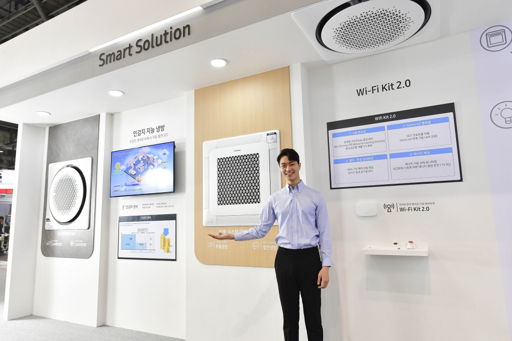 ▲ 삼성전자 모델이 ‘스마트 솔루션’ 존에서 사용 편의성과 에너지 효율성을 극대화한 ‘인감지 지능 냉방’과 ‘와이파이 키트’를 소개하고 있다.