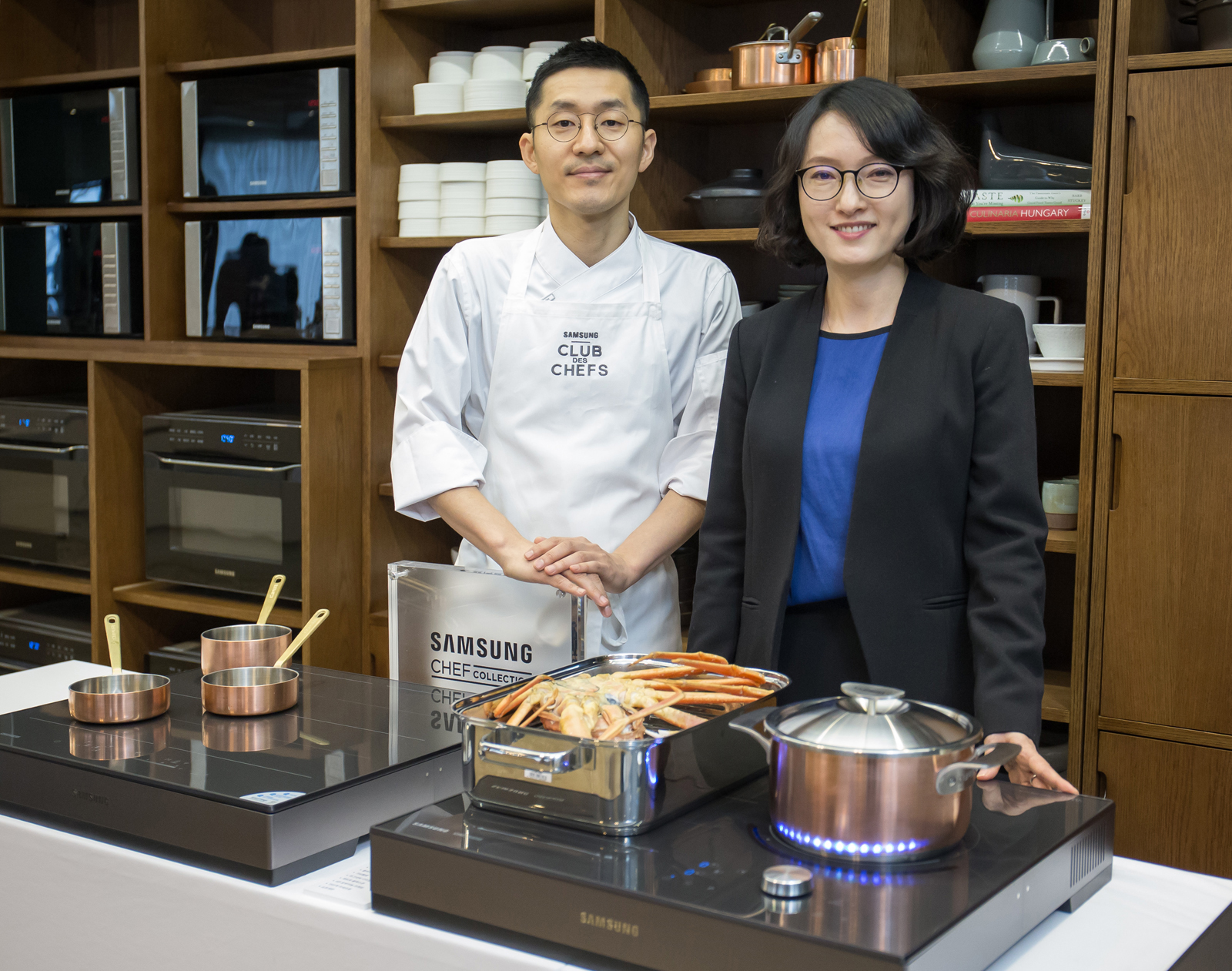 ▲ 12일 서울 중구에 위치한 샘표 우리맛 공간에서 삼성 클럽드셰프 코리아의 강민구 셰프(좌측)와 삼성전자 생활가전사업부 상품전략팀 양혜순 상무가 2019년형 삼성전자 전기레인지 인덕션 신제품을 소개하고 있다.
