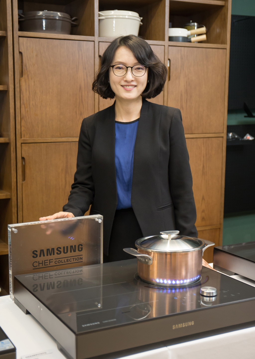 ▲ 12일 서울 중구에 위치한 샘표 우리맛 공간에서 삼성전자 생활가전사업부 상품전략팀 양혜순 상무가 2019년형 삼성전자 전기레인지 인덕션 신제품을 소개하고 있다.