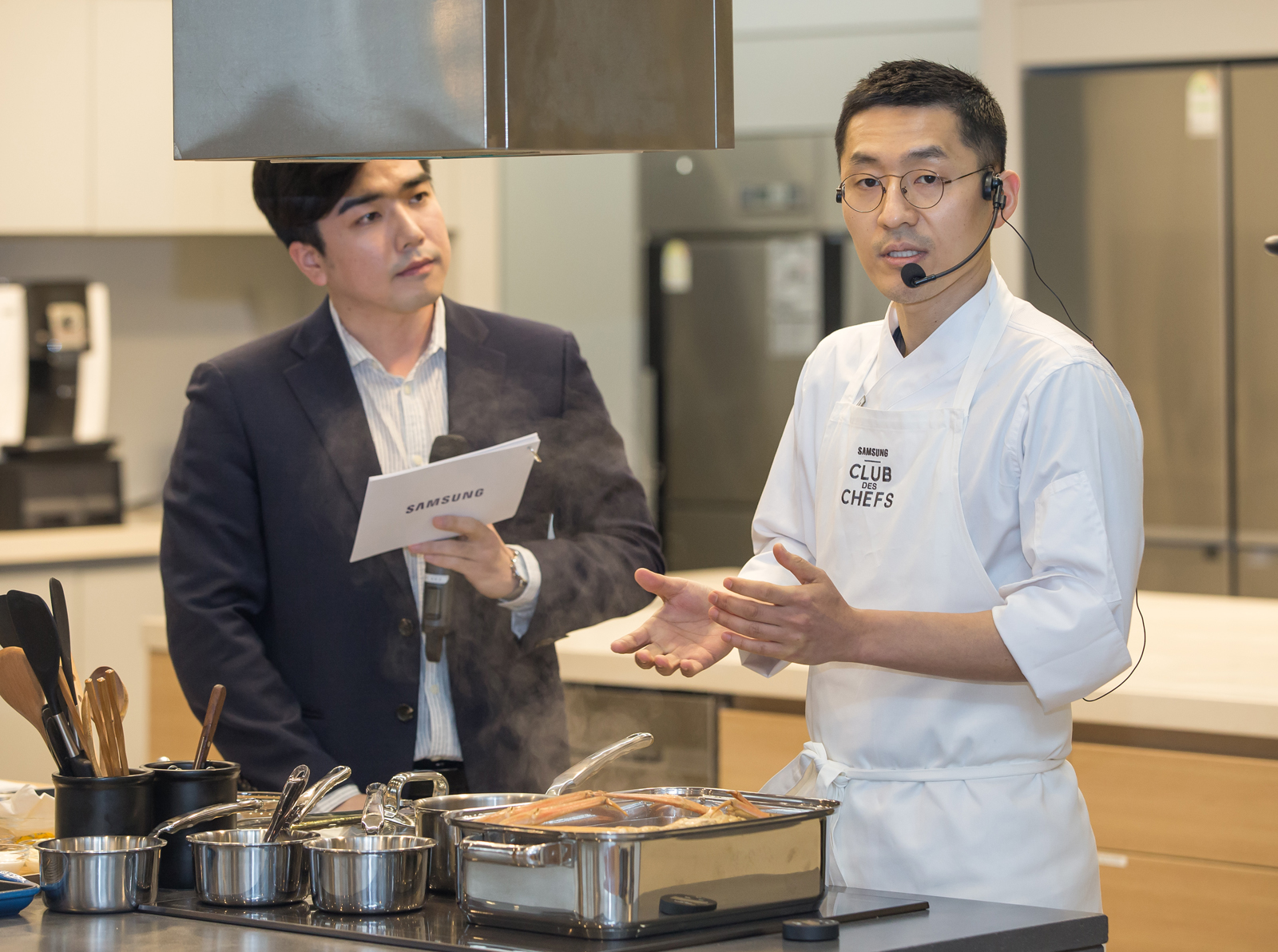 ▲ 12일 서울 중구에 위치한 샘표 우리맛 공간에서 삼성 클럽드셰프 코리아의 강민구 셰프(우측)가 2019년형 삼성전자 전기레인지 인덕셔 올 플렉스 제품을 활용해 요리를 하면서 제품의 주요 특장점을 소개하고 있다.