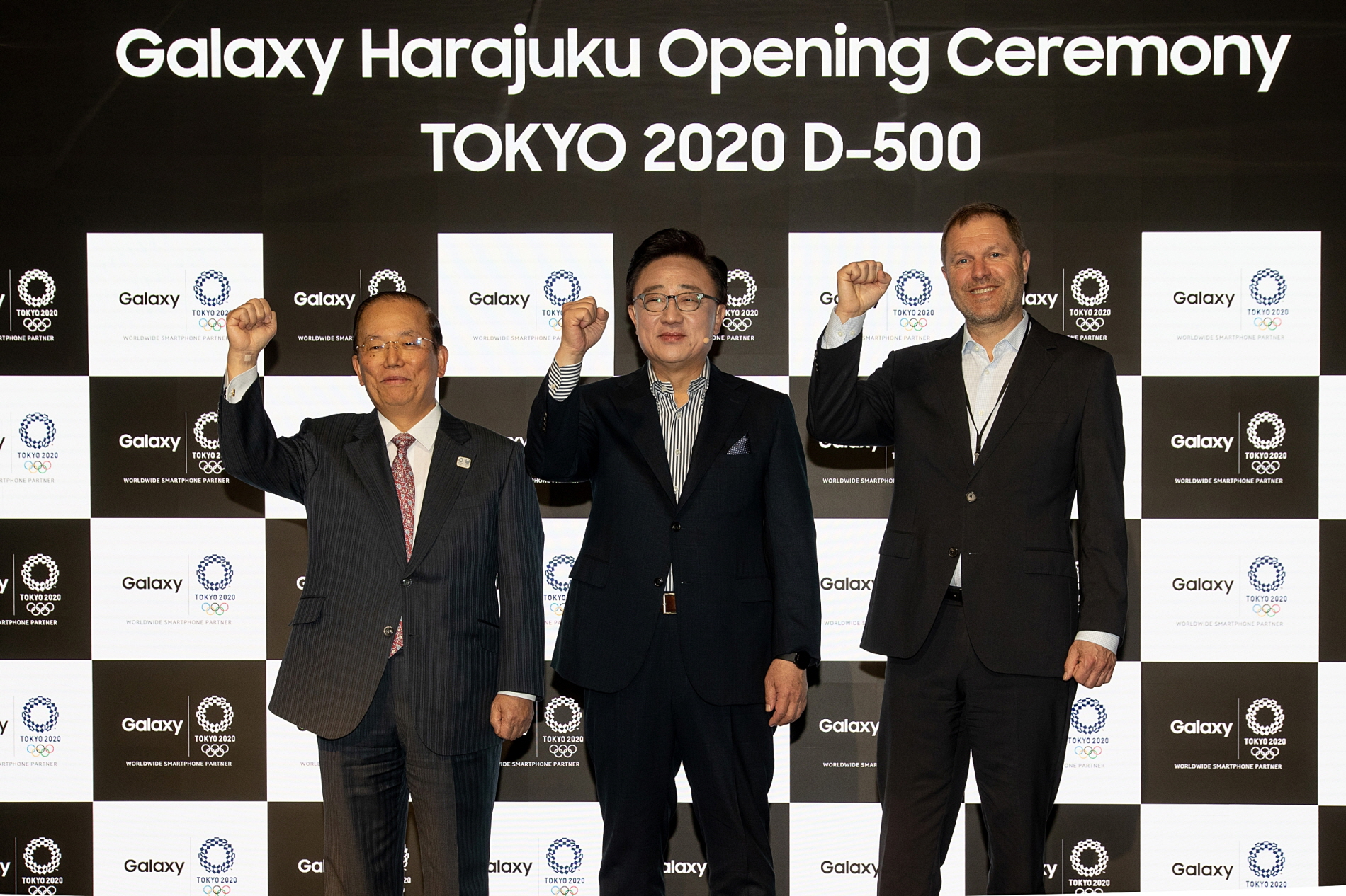 ▲ 12일 일본 도쿄에서 열린 ‘갤럭시 하라주쿠’ 개관식에 참석한 (왼쪽부터) 무토 토시로(Toshiro Muto) 2020 도쿄올림픽 조직위원회 사무총장, 삼성전자 IM부문장 고동진 사장, 티모 루베(Timo Lumme) IOC 마케팅국장이 2020 도쿄올림픽의 성공적인 개최를 기원하며 기념사진을 촬영하고 있다.
