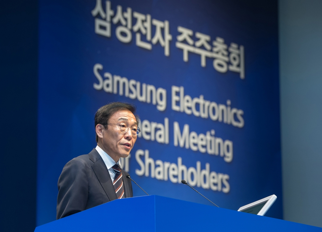 ▲ 3월 20일 삼성전자 서초사옥 다목적홀에서 개최된 ‘삼성전자 제 50기 정기 주주총회’에서 김기남 대표이사 부회장이 인사말을 하고 있다.