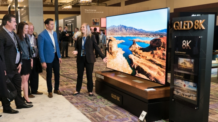 ▲ 삼성전자 직원이 미국 주요 거래선들에게 삼성 QLED 8K를 소개하고 있다.