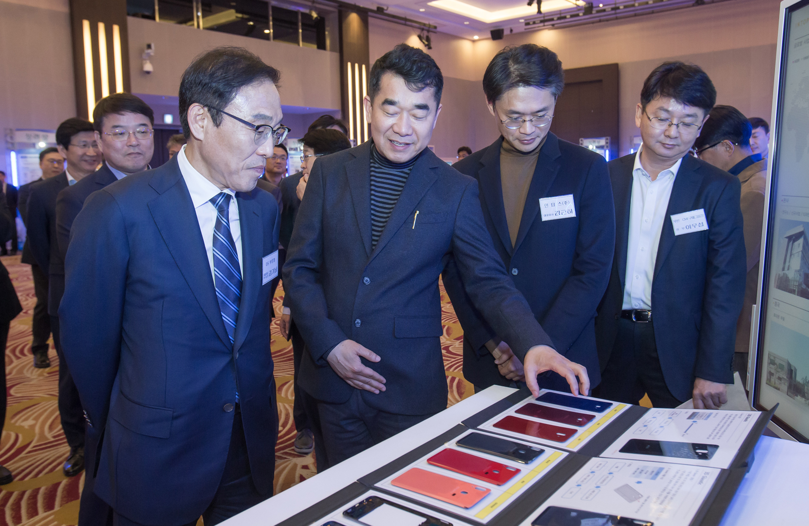 ▲ 28일 서울 양재동 더케이호텔에서 열린 ‘2019 상생협력데이’에서 휴대폰 케이스 협력사 ‘인탑스’의 이형민 상무가 김기남 삼성전자 대표이사 부회장에게 갤럭시 스마트폰에 적용된 신소재에 대해 설명하고 있다.