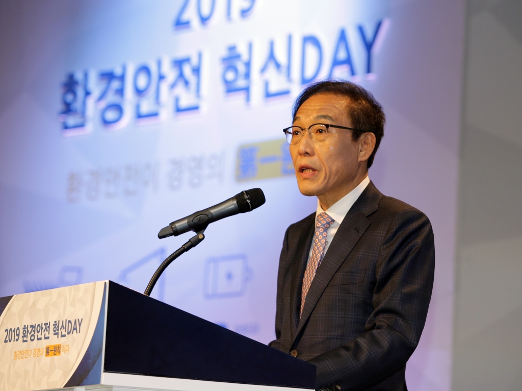 ▲ 29일 삼성전자 화성캠퍼스 부품연구동(DSR)에서 열린 ‘2019 환경안전 혁신Day’에서 삼성전자 대표이사 김기남 부회장이 개회사를 하고 있다.