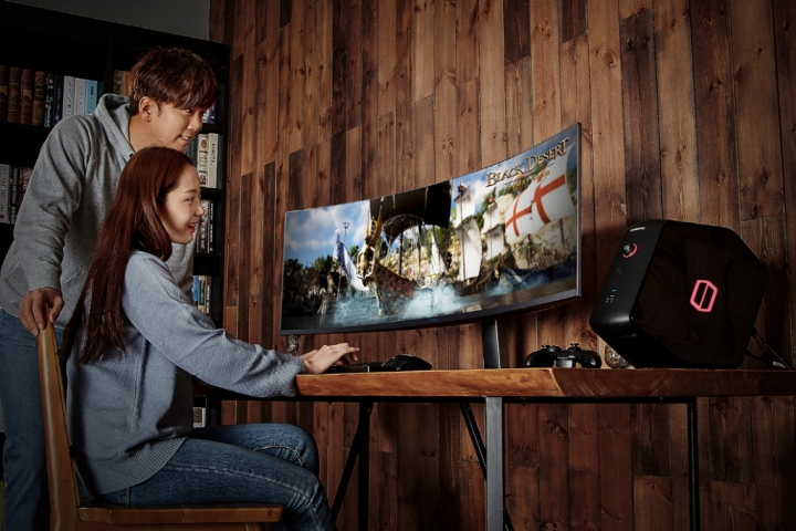 ▲ 삼성전자 모델들이 8일 국내 출시하는 듀얼 QHD 게이밍 모니터 ‘CRG9’을 소개하고 있다.