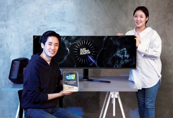 ▲ 삼성전자 모델들이 8일 국내 출시하는 듀얼 QHD 게이밍 모니터 ‘CRG9’을 소개하고 있다.