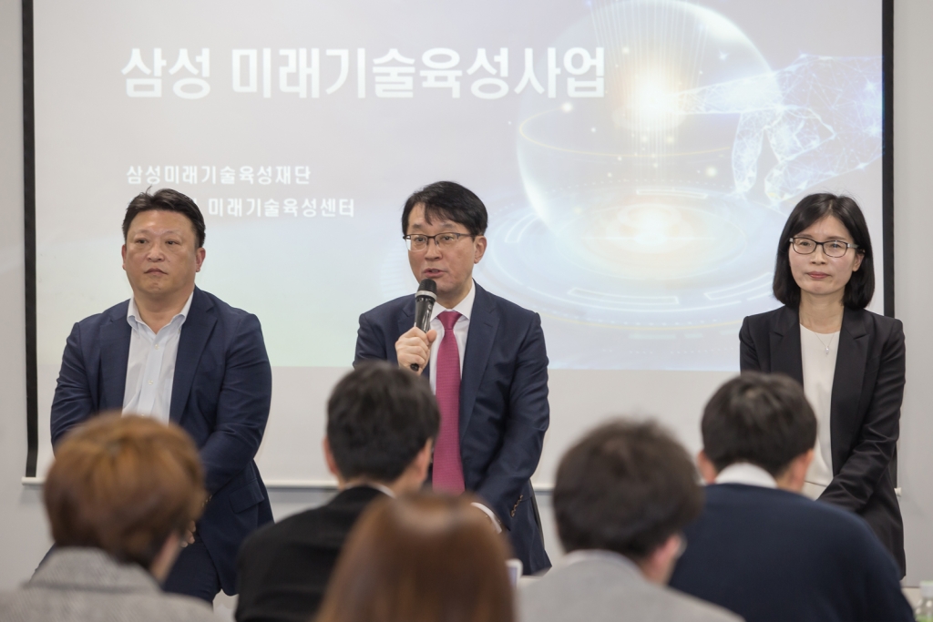 ▲ 10일 열린 삼성미래기술육성사업 기자간담회에서 음두찬 삼성미래기술육성센터장(상무), 김성근 삼성미래기술육성재단 이사장, 심사위원장 연세대학교 김은경 교수(왼쪽부터)가 답하고 있다.