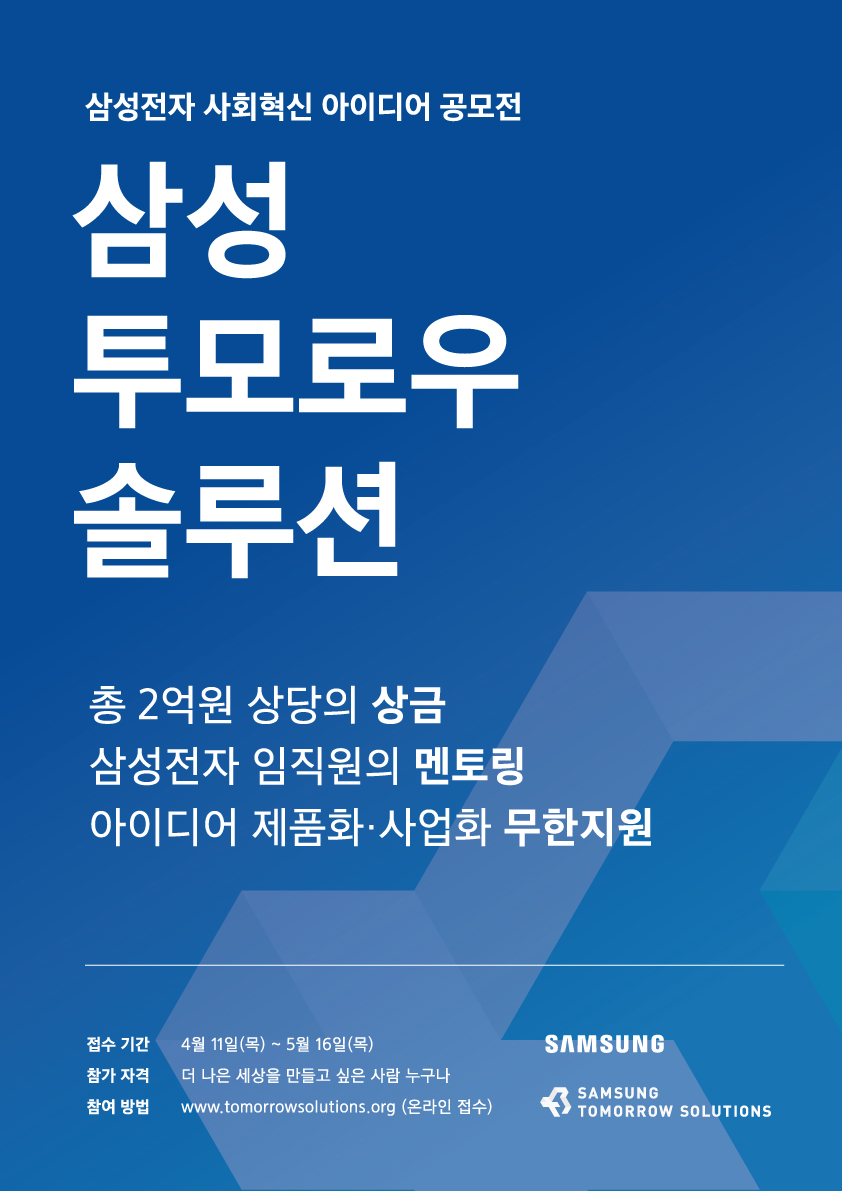 2013년부터 매년 실시하는 '삼성 투모로우 솔루션' 은 더 나은 세상을 만들고 싶은 사람이라면 누구나 참여할 수 있는 공모전으로, 사회 문제 해결을 위한 창의적인 아이디어를 제안하고 직접 사회에 적용하는 대회이다.