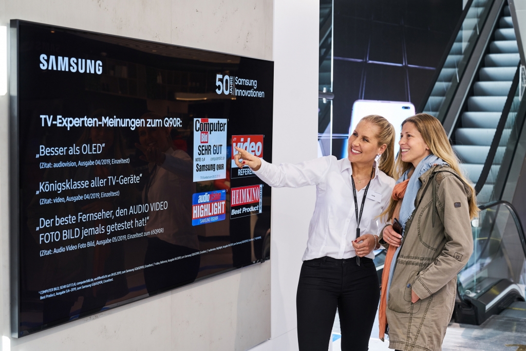 ▲ 독일 프랑크푸르트 시내에 위치한 삼성 쇼케이스 매장에서 판매 직원이 고객에게 영상·음향기기 전문 매체들로부터 호평받은 QLED TV를 소개하고 있다.