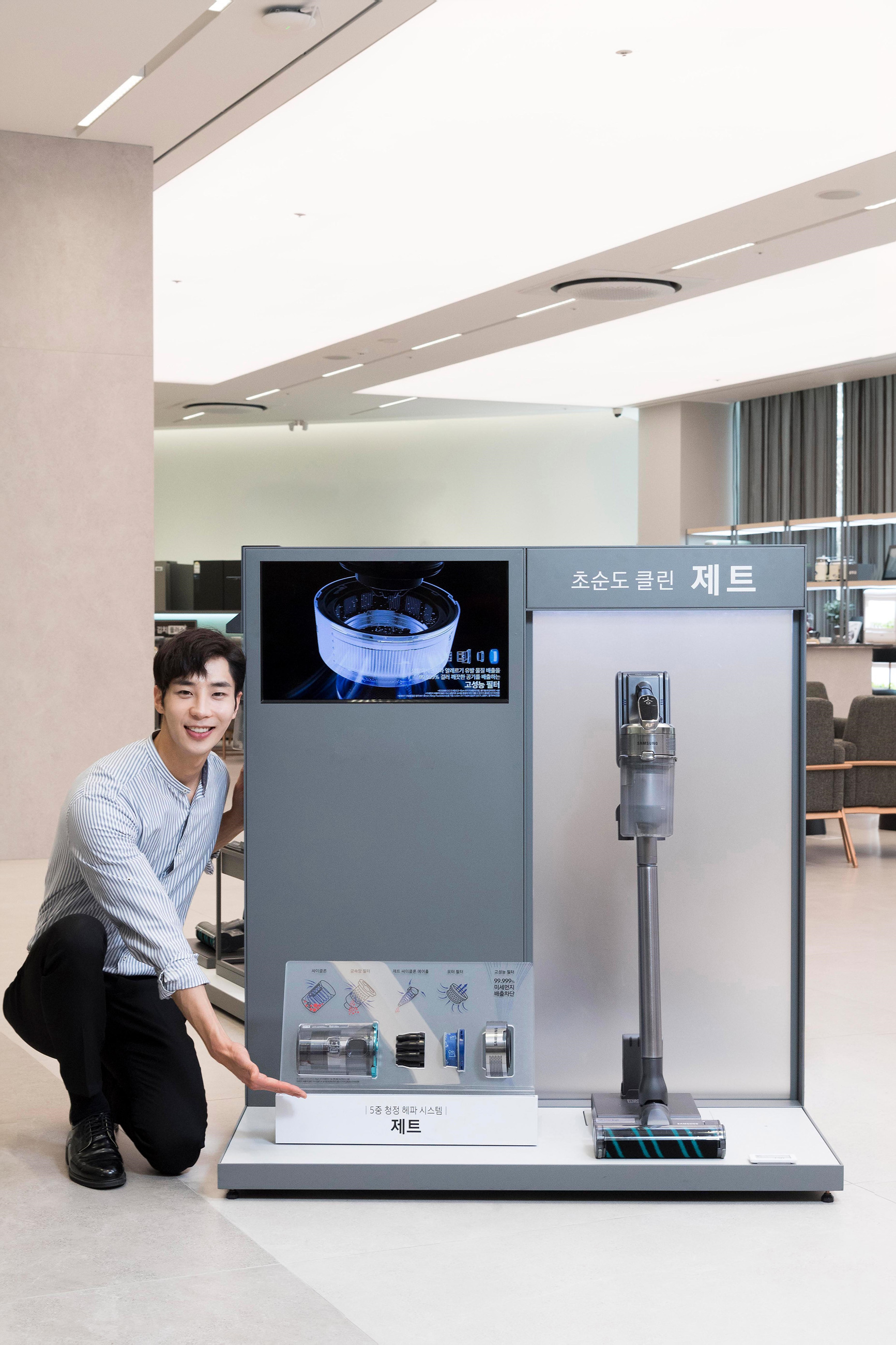 ▲ 삼성전자 모델이 삼성전자의 프리미엄 무선 청소기 ‘삼성 제트’를 소개하고 있다. ‘삼성 제트’는 미세먼지와 알레르기 유발 물질 배출 차단 성능과 인체공학적 디자인 등 소비자의 건강을 배려한 차별화된 기술로 좋은 평가를 받고 있다.