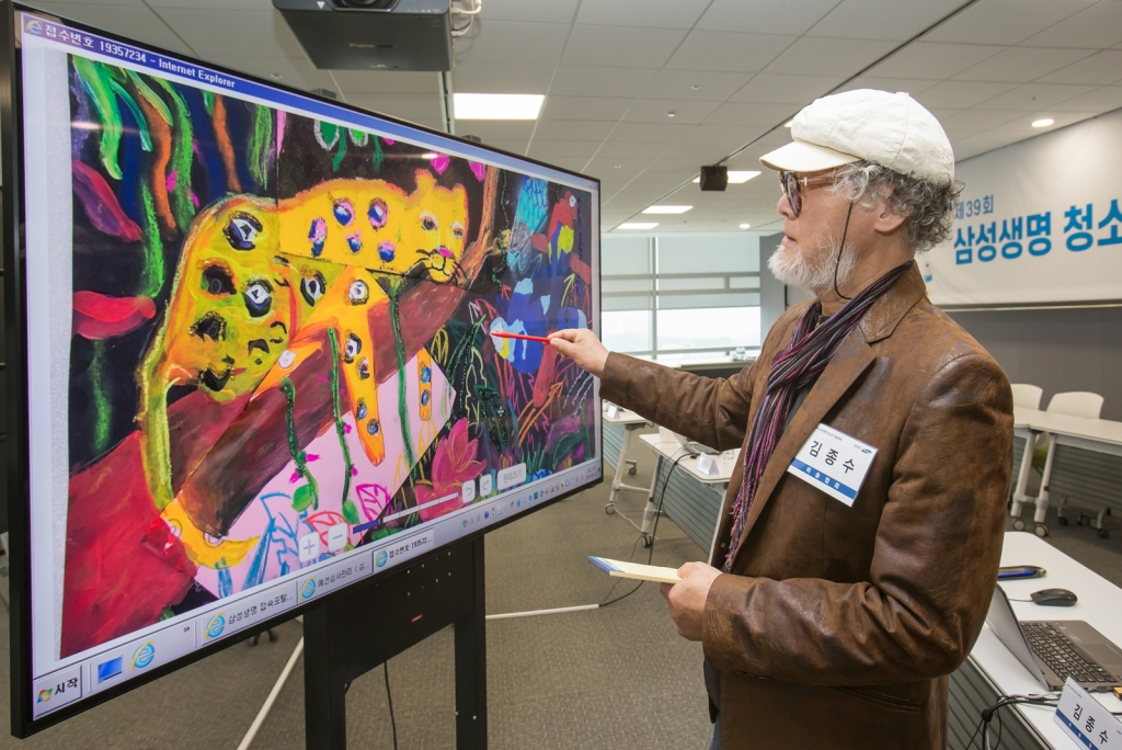 ▲ 한국미술협회 김종수 부이사장이 23일 서울 서초동에 위치한 삼성생명 대강의장에서 삼성 QLED 8K TV를 활용해 삼성생명이 주최하는 ‘제39회 청소년 미술대회’ 예선 작품을 심사하고 있다.