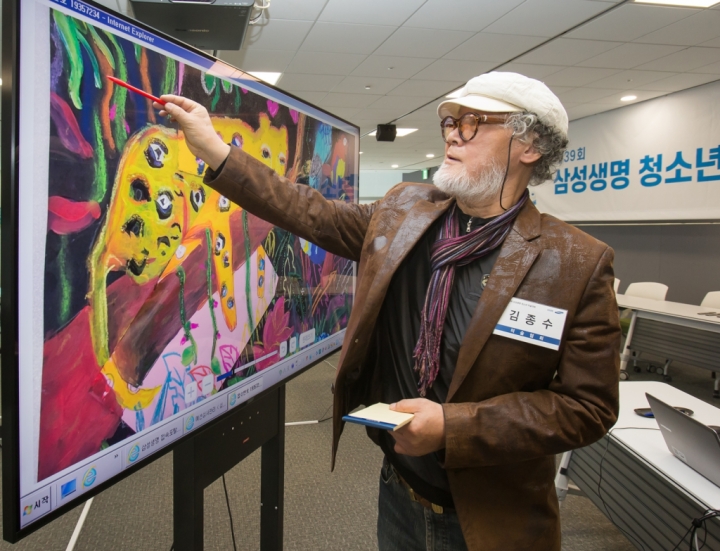 ▲ 한국미술협회 김종수 부이사장이 23일 서울 서초동에 위치한 삼성생명 대강의장에서 삼성 QLED 8K TV를 활용해 삼성생명이 주최하는 ‘제39회 청소년 미술대회’ 예선 작품을 심사하고 있다.