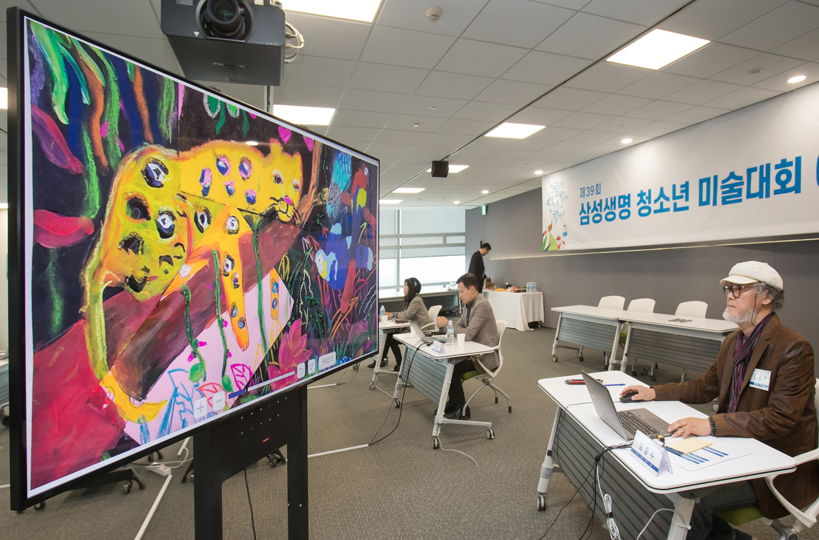 ▲ 한국미술협회 김종수 부이사장이 23일 서울 서초동에 위치한 삼성생명 대강의장에서 삼성 QLED 8K TV를 활용해 삼성생명이 주최하는 ‘제39회 청소년 미술대회’ 예선 작품을 심사하고 있다.