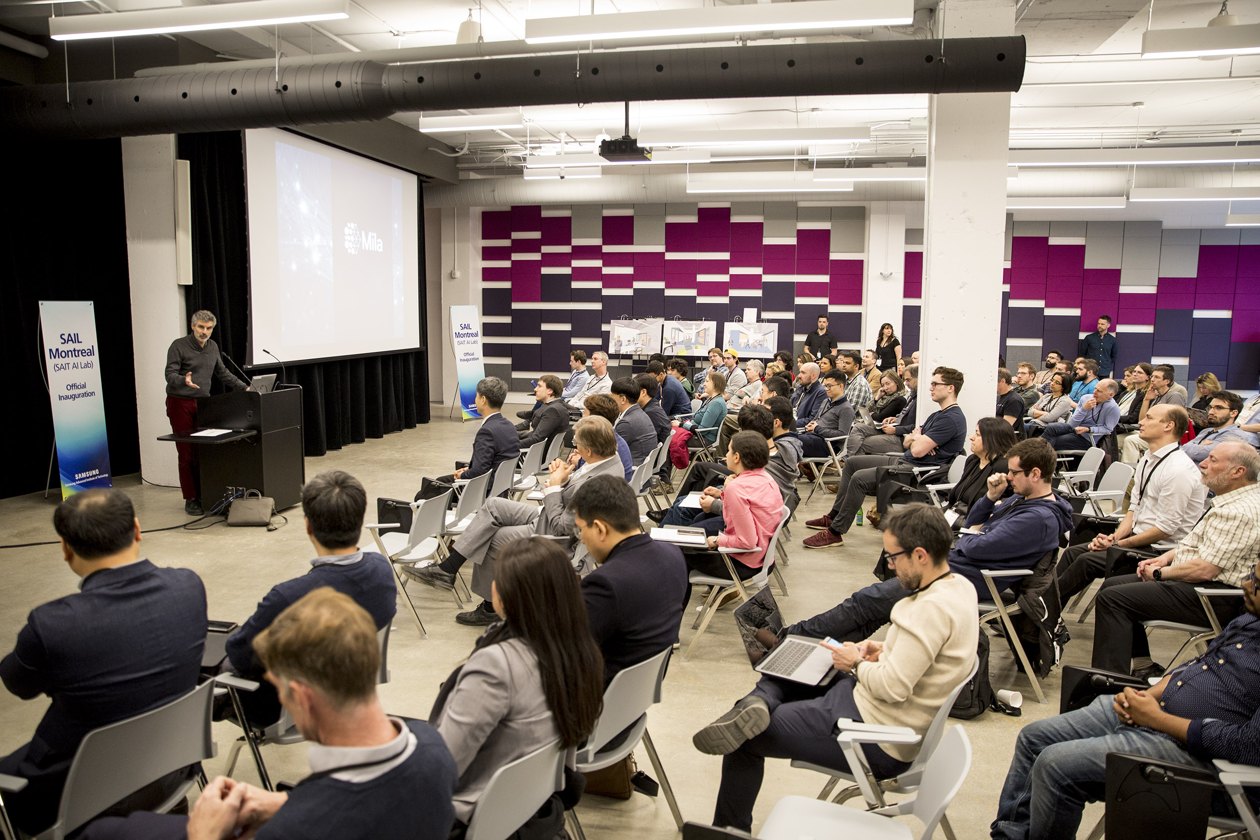 ▲ 삼성전자 종합기술원 몬트리올 AI 랩 개소 현장. 5월1일(현지시간) 열린 삼성전자 종합기술원 몬트리올 AI 랩 확장이전 행사에 참여한 주요 연구진 외 참석자들이 요슈아 벤지오(Yoshua Bengio, 몬트리올大) 교수의 환영사를 듣고있다.