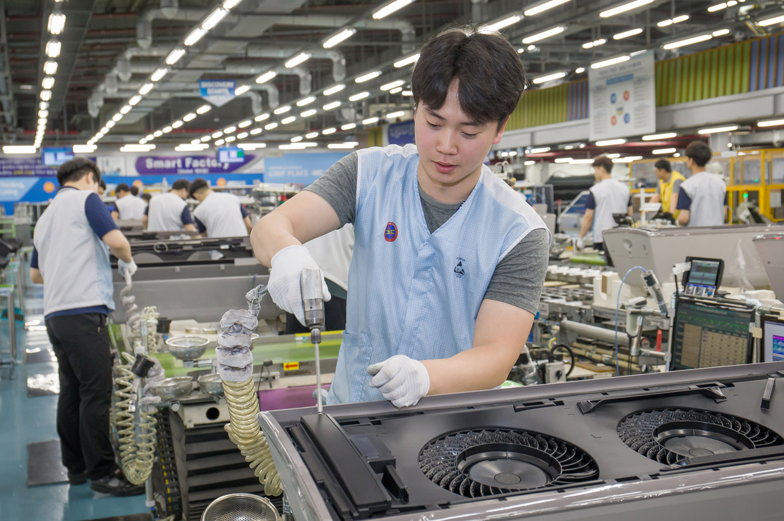 광주광역시 광산구 하남산단 6번로에 위치한 삼성전자 광주사업장에서 직원들이 '무풍에어컨'을 생산하고 있다.