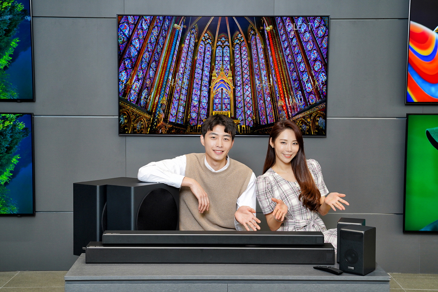 ▲ 삼성전자가 14일 QLED TV와 함께 사용하기 좋은 사운드바 ‘Q시리즈’ 4종을 삼성 하만카돈 브랜드로 국내 시장에 출시한다. 삼성전자 모델이 7.1.4채널을 지원하는 HW-Q950R과 3.1.2채널을 지원하는 HW-Q750R을 소개하고 있다. ‘Q시리즈’ 사운드바에는 입체 음향 기술인 돌비사의 애트모스와 DTS사의 DTS:X를 탑재하여 전후좌우뿐 아니라 마치 천장 위에서 소리가 쏟아져 내리는 듯한 입체적인 사운드를 경험할 수 있다. ‘Q시리즈’ 사운드바는 출고가 기준 HW-Q950R이 180만원, HW-Q850R이 130만원, HW-Q750R이 90만원, HW-Q650R이 60만원이다.