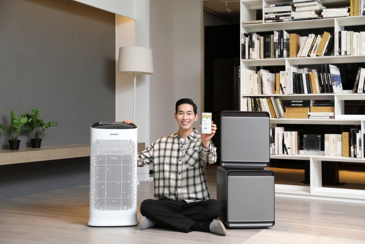 ▲ 삼성전자는 최근 각 가정에서 방마다 공기청정기를 놓고 사용하는 트렌드를 고려해 실내 공기질 통합 관리 서비스인 ‘스마트싱스 에어(SmartThings Air)’를 새롭게 출시했다고 14일 밝혔다. 이 서비스는 안방·거실·아이방 등 각 공간에 설치된 공기청정기의 센서로 측정된 실내 공기 오염도와 실외 공기질·예측 정보까지 조합해 실시간으로 실내외 공기질 상태를 한눈에 확인할 수 있도록 해 주며, 상황별로 최적의 공기질 관리법을 추천해 준다. ‘스마트싱스 에어’는 스마트폰에 스마트싱스 앱을 설치하고 와이파이를 지원하는 삼성 공기청정기 모델과 연동하면 간편하게 이용할 수 있다. 삼성전자 모델이 실내 공기질 통합 관리 서비스 ‘스마트싱스 에어’를 소개하고 있다.