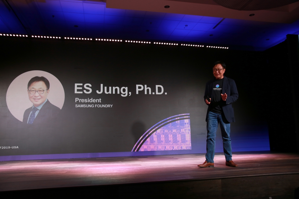 ▲ 5월 14일(현지시간) 미국 산타클라라에서 열린 ‘삼성 파운드리 포럼 2019’에서 삼성전자 파운드리 사업부 정은승 사장이 기조 연설을 하고 있다.