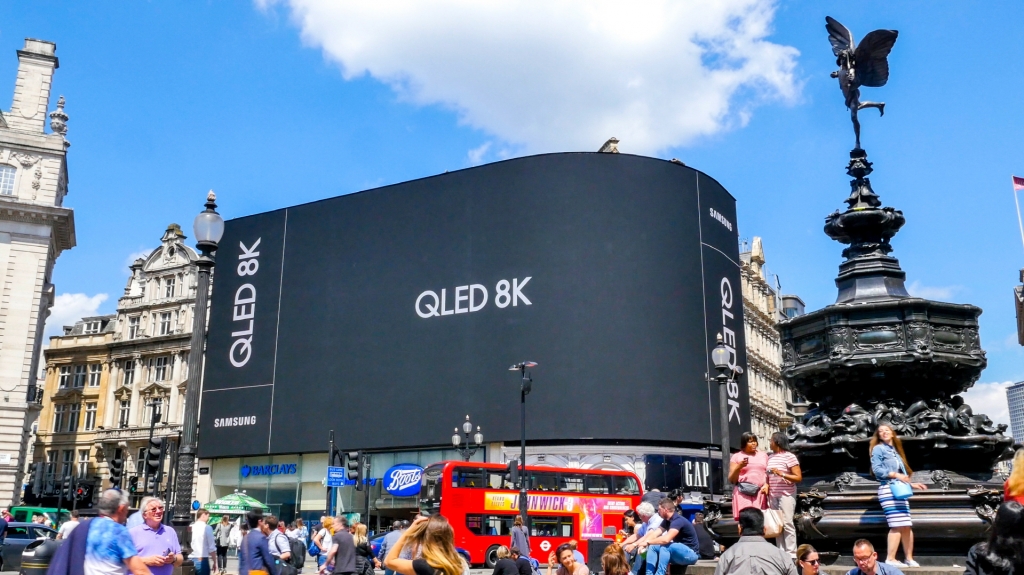 삼성전자가 최근 영국 런던의 랜드마크로 유명한 피카딜리 서커스(Piccadilly Circus) 전광판에 ‘QLED 8K’TV 광고를 시작했다. 피카딜리 서커스는 주변에 유명 관광지가 많아 하루 유동인구가 30만명에 달하는 장소로 광고 노출도가 매우 높다.