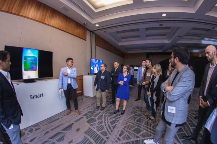 ▲ 지난 달 31일(현지시간) 브라질 상파울루에 위치한 르네상스 호텔에서 삼성전자 주최로 열린 ‘QLED 8K’ 테크세미나에 참가한 업계 전문가들이 QLED TV의 스마트기능을 살펴보고 있다.