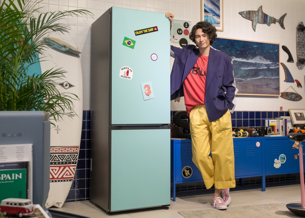 ▲ 삼성전자 모델이 강남구 도산대로에 위치한 삼성디지털프라자 강남본점에서 나만의 제품 조합이 가능하고 색상·재질 등 나만의 디자인을 선택할 수 있는 맞춤형 가전 비스포크 냉장고를 소개하고 있다.