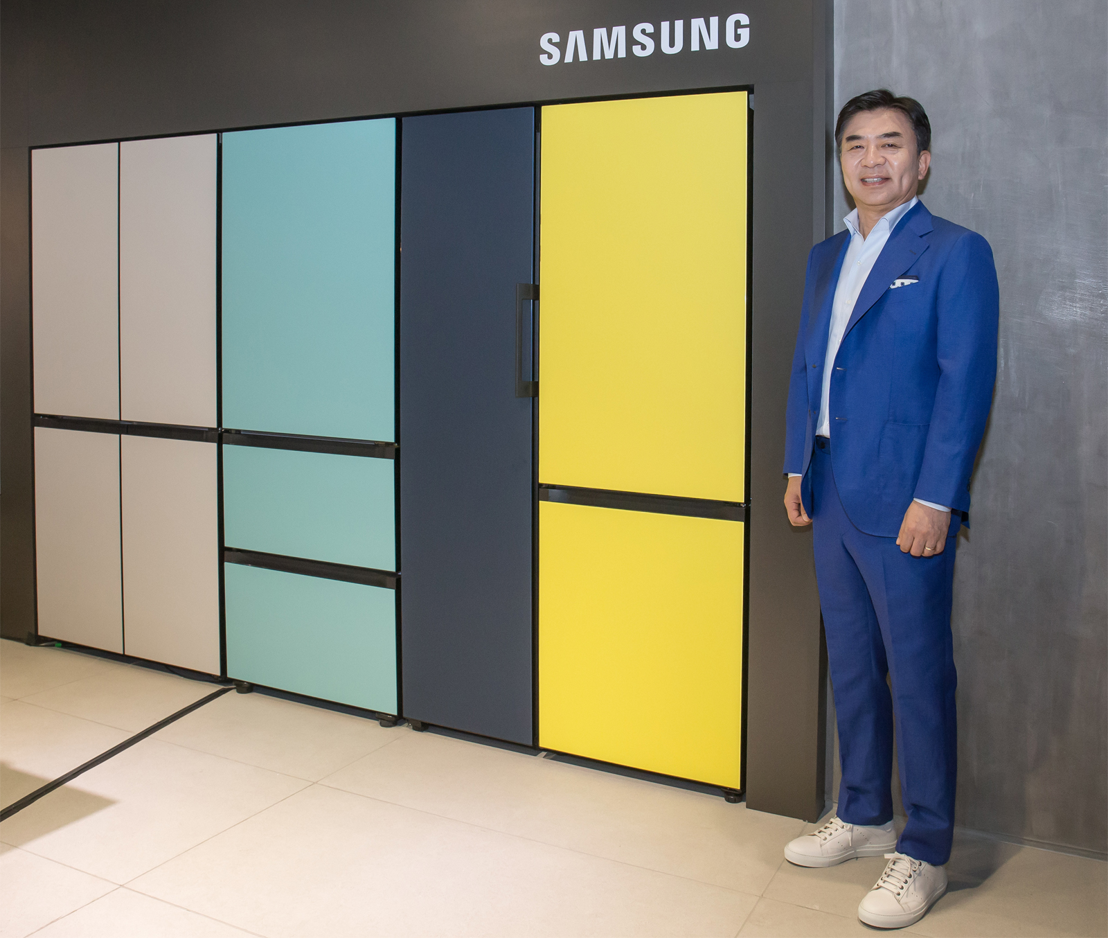 ▲ 김현석 삼성전자 대표이사가 강남구 도산대로에 위치한 삼성디지털프라자 강남본점에서 나만의 제품 조합이 가능하고 색상·재질 등 나만의 디자인을 선택할 수 있는 맞춤형 가전 비스포크 냉장고를 소개하고 있다.