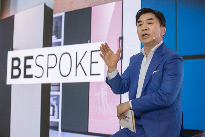 ▲ 김현석 삼성전자 대표이사가 생활가전 사업의 새로운 비전인 ‘프로젝트 프리즘(Project PRISM)’과 맞춤형 가전 시대를 여는 첫번째 신제품 비스포크 냉장고를 소개하고 있다.