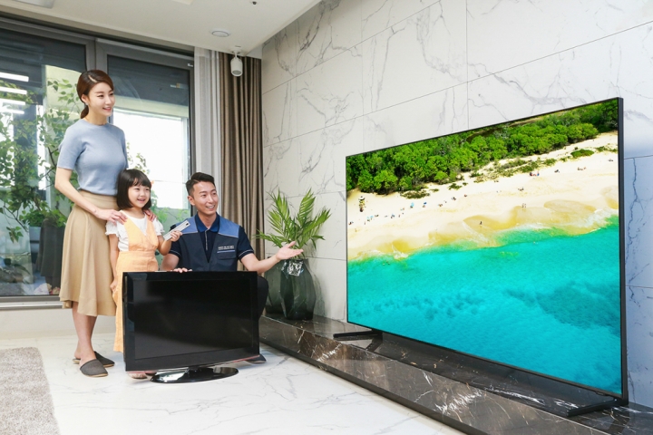 ▲ 삼성전자 TV 설치기사가 ‘대국민 TV 보상 페스티벌’을 통해 TV를 구매한 소비자 가정에서 구형 TV를 회수하고 2019년형 QLED TV를 설치한 후 사용법을 설명하고 있다.