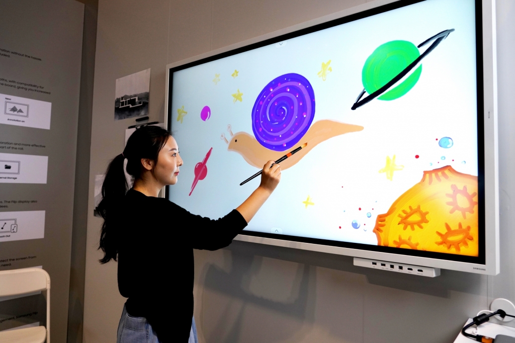 ▲ 삼성전자 직원이 현지시간 12일 미국 올랜도에서 열리는 세계 최대 규모의 전문 AV(AudioVisual) 전시회 ‘인포콤 2019 (Infocomm 2019)’에서 ‘삼성 플립’ 신제품을 소개하고 있다.