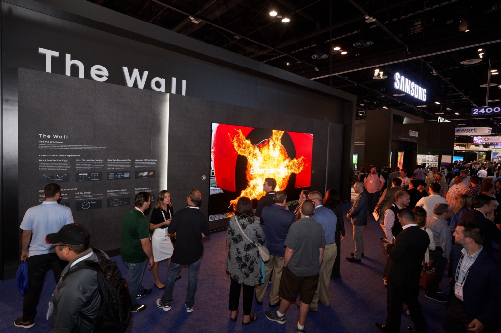 ▲ 현지시간 12일 미국 올랜도에서 열리는 세계 최대 규모의 전문 AV(AudioVisual) 전시회 ‘인포콤 2019 (Infocomm 2019)’에 마련된 삼성전자 전시관에서 관람객들이 홈 시네마용 디스플레이 ‘더 월 럭셔리’ 219형 제품을 체험하고 있다.